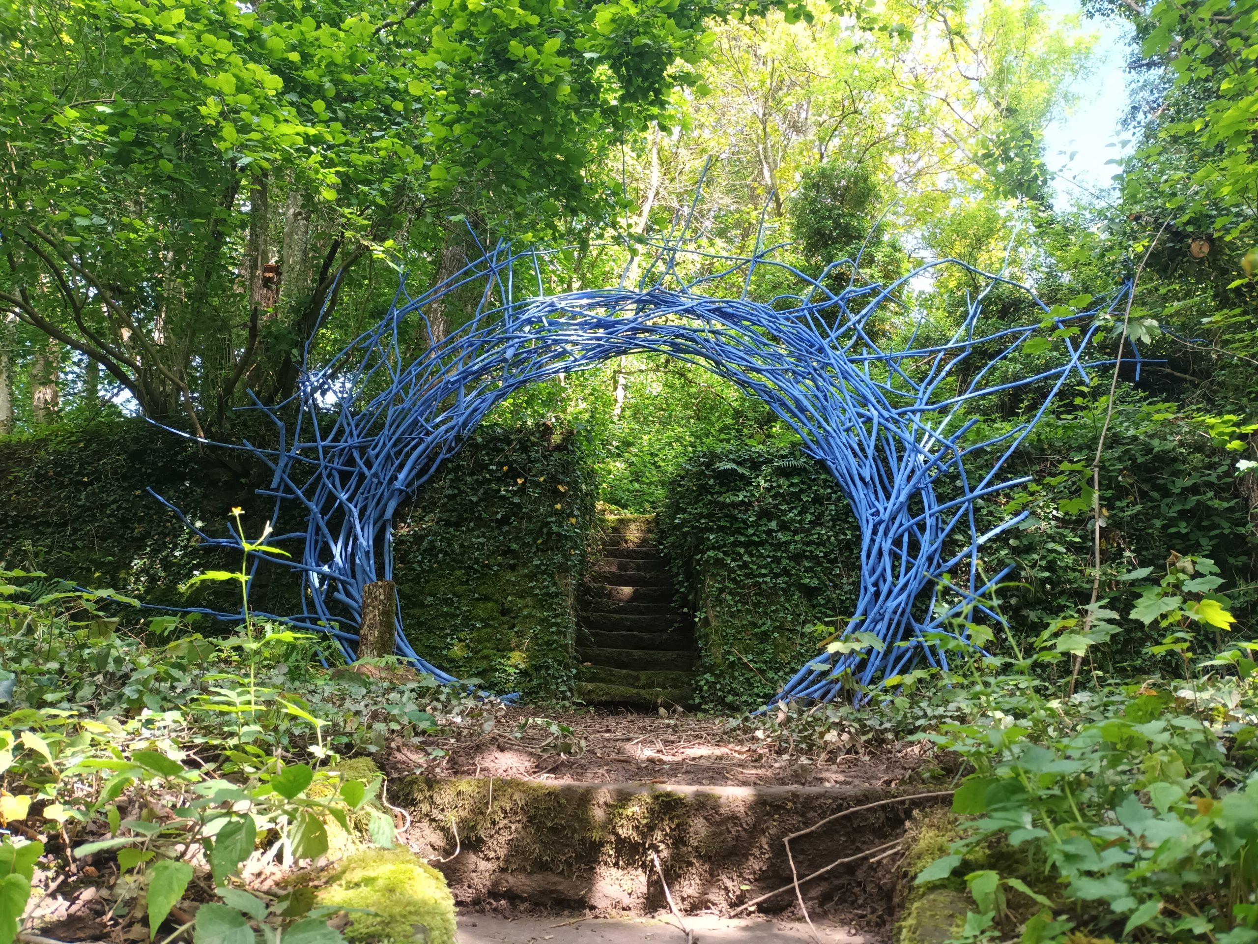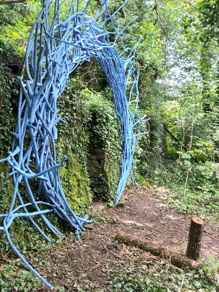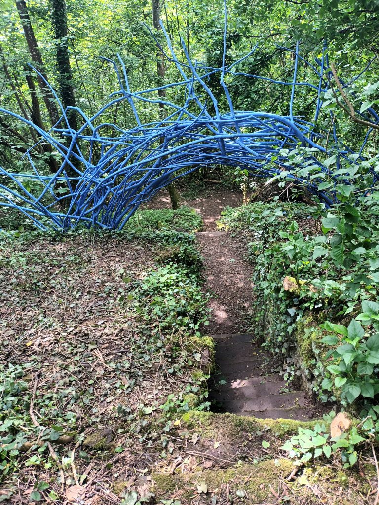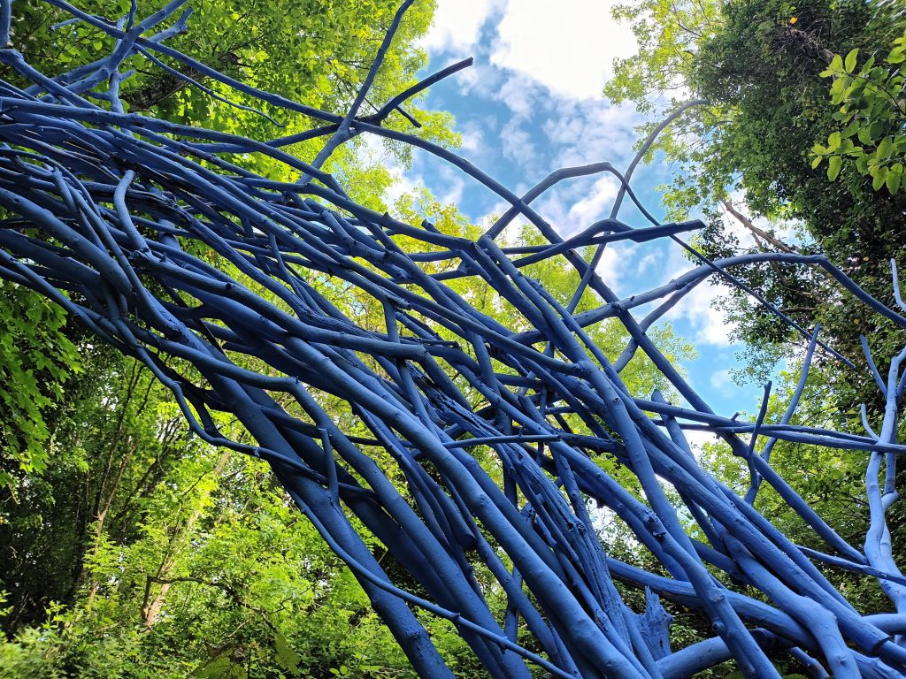 Ben Hirtz bringt sein malerisches Blau auf und in den „Hahn“ ein. Zum ersten Mal ist das Blau nicht nur Teil seiner Skulptur, sondern kann auf der Kunstroute durch „Das Tor“ durchschritten werden. Nach der blauen Linie, die die Eigendynamik im Wald im statischen Moment markierte, dem blauen Vorhang, der den Wind im Wald visuell widerspiegelte und reizvolle Auf- und Durchblicke gestattete, wird das Blau jetzt vieldimensional erlebbar. Der Künstler errichtet „Das Tor“ aus blauen Ästen und formt diese zu einem Ring-Kreis. „Das Tor“ teilt den Weg in ein davor und dahinter. Wer sich darauf zubewegt erkennt die künstlerische Intervention. Wer mitten im Tor stehen bleibt ist nah im Blau – wer zurückschaut ändert die Perspektive. Die Dimensionen Nah und Fern, Farbe und Licht gewinnen an Bedeutung und Schärfe.Hirtz‘ Skulptur „Das Tor“ ist ein Angebot: Interaktiv kann jeder Einzelne seine Position und Sicht auf Kunst, Natur, Licht und Farbe finden.Die Jury sagt: „Der Reiz der Skulpturen von Ben Hirtz auf dem Hahn bestehen darin, dass es ihm gelingt, fokussiert mit seinem malerischen Blau, seinen Arbeiten immer wieder eine neue Dimension hinzuzufügen und diese erlebbar zu machen. Das Blau von Hirtz ist markanter Teil der Kunstroute.“Der akademisch ausgebildete Künstler Ben Hirtz ist seit mehr als 50 Jahren künstlerisch aktiv und lebt und arbeitet in Malbergweich in der Eifel.