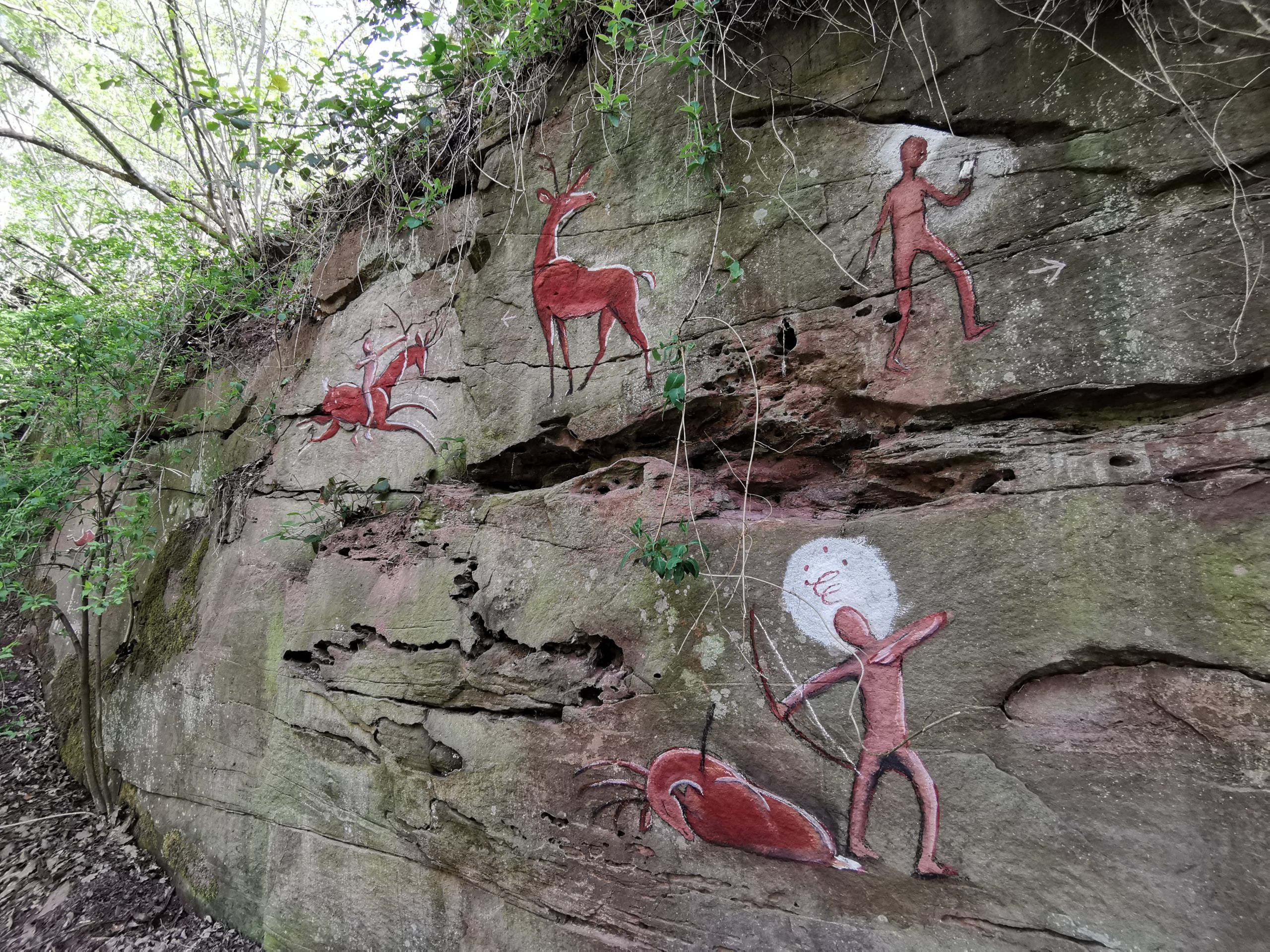 Für die Kunstroute fertigte Rijcken ein „prähistorisches Felsbild“ mit Farben, Kohle und Kreiden an, die auch schon vor tausenden von Jahren verwendet worden sein könnten. In fünf Bildern springt Rijcken durch die Geschichte.