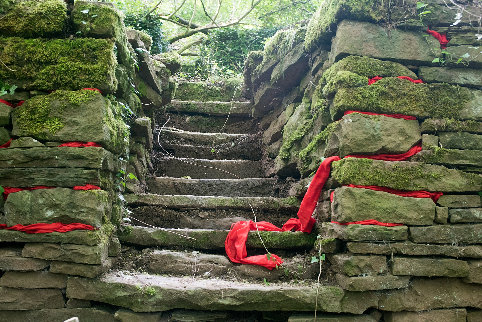 Mit roten Stoffbahnen, gespannt in den Fensterbögen des kirchlichen Kreuzgangs der Stiftskirche Kyllburg, schafft Marie Senftleben-Gudrich in ihrer Arbeit ‚Natur — Kultur‘ einen gewollten Kontrast.Der historische Raum tritt in eine stille Zwiesprache mit der signalstarken, roten Farbe des Tuchs, welches die Zwischenräume des Gemäuers betont und als Leerstellen sichtbar werden lässt.Auch in ihrer zweiten Arbeit ‚Natur — Kultur‘ tritt die Farbe Rot als zentrales Element auf, dieses Mal als Füllstoff einer alternden Mauer am Wegesrand. Und wiederum lässt das Material die Zwischenräume im Bauwerk, als Sinnbild des Wandels, erkennbar werden.Marie Senftleben-Gudrich stellt in beiden Arbeiten die Frage nach Vergangenem und Gegenwärtigem, danach was einst war und was heute bleibt. In ihrer ästhetischen Intervention macht sie räumliche und zeitliche Grenzen erfahrbar und thematisiert zugleich deren Auflösung im Wandel der Zeit. Die rote Farbe des Tuchs durchdringt, einer Lebensader gleich, die alten Gemäuer und verleiht diesen eine neue Lebendigkeit. Senftleben-Gudrichs Arbeiten dienen damit nicht allein der bloßen Sichtbarmachung, sondern führen das Alte zugleich einer neuen Sinnhaftigkeit zu. So regt die Künstlerin nicht zuletzt auch zur Reflexion über den eigenen Umgang mit der Natur und der Kulturgeschichte an.