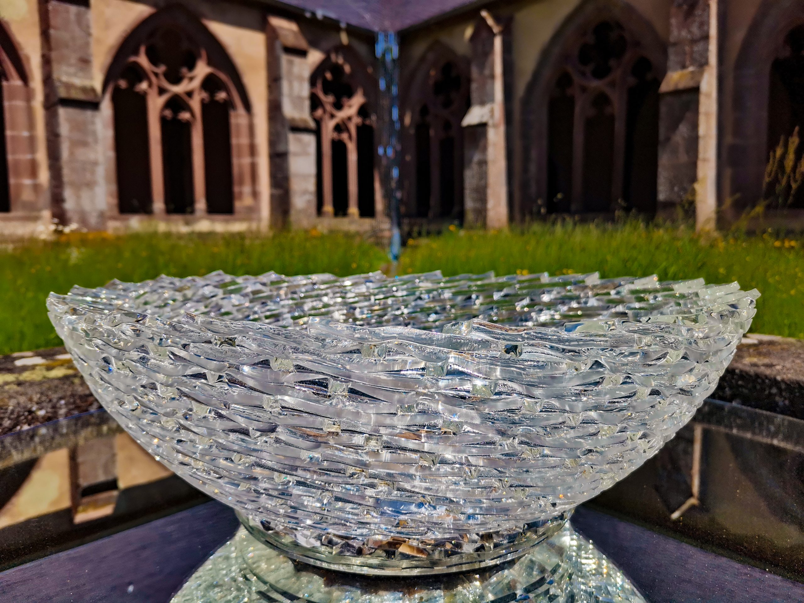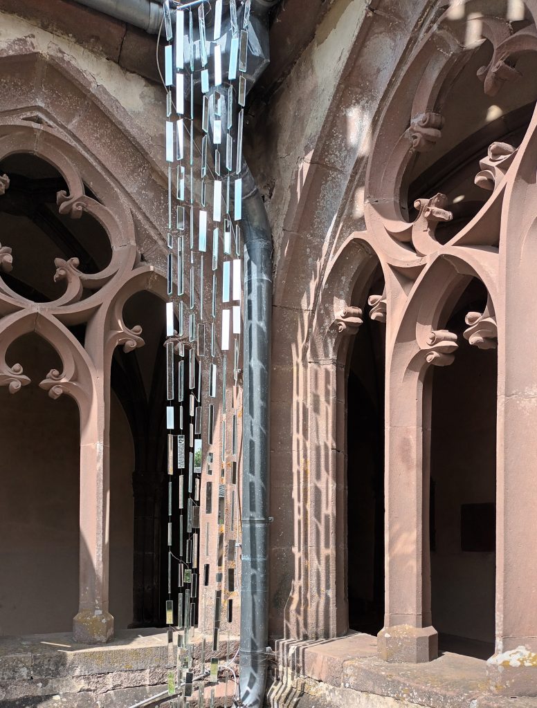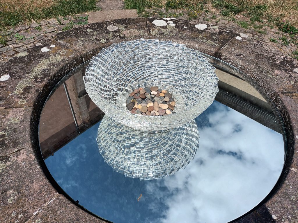Für Hedi Schon ist das Thema „Fülle“ eng mit einem intakten Kreislauf verbunden. Die Natur kann nur dann Fülle hervorbringen, wenn alle notwendigen Komponenten ausreichend und gesund vorhanden sind. Wasser ist ein zentraler Bestandteil der Natur.Die Glasinstallation zeigt den Weg des Regenwassers von der Dachrinne bis zur Zisterne.