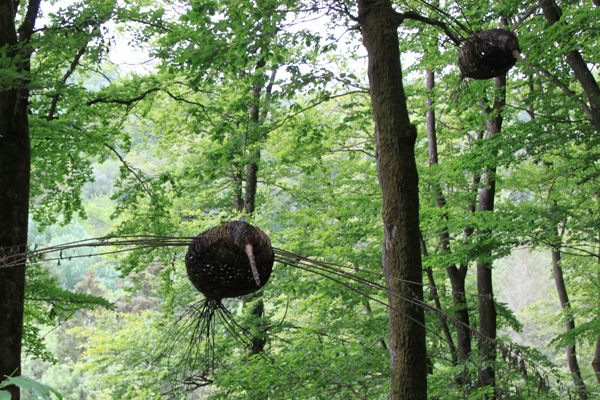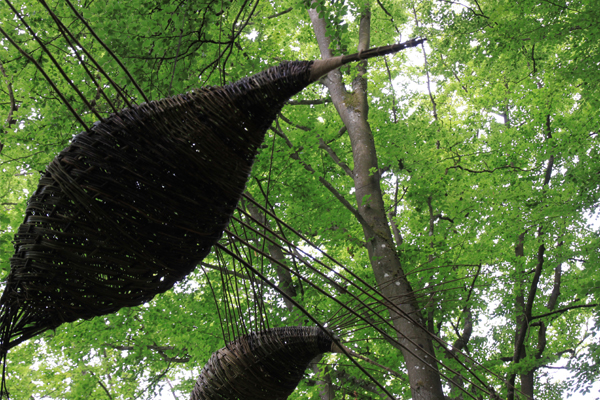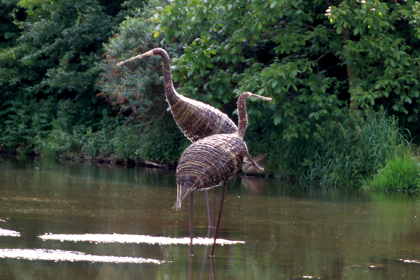 Vogelstatuen, aus Weiden geflochten in der Umgebung, etwas zwischen einem Storch, einem Reiher und einem Kranich. Diese Vögel stellen die Verbindung zum Land her, da sie immer dorthin zurückkehren, von wo sie herkommen, selbst wenn sie um die ganze welt geflogen sind. Hergestellt aus der Weide, die die europäischen Flusslandschaften kennzeichnet