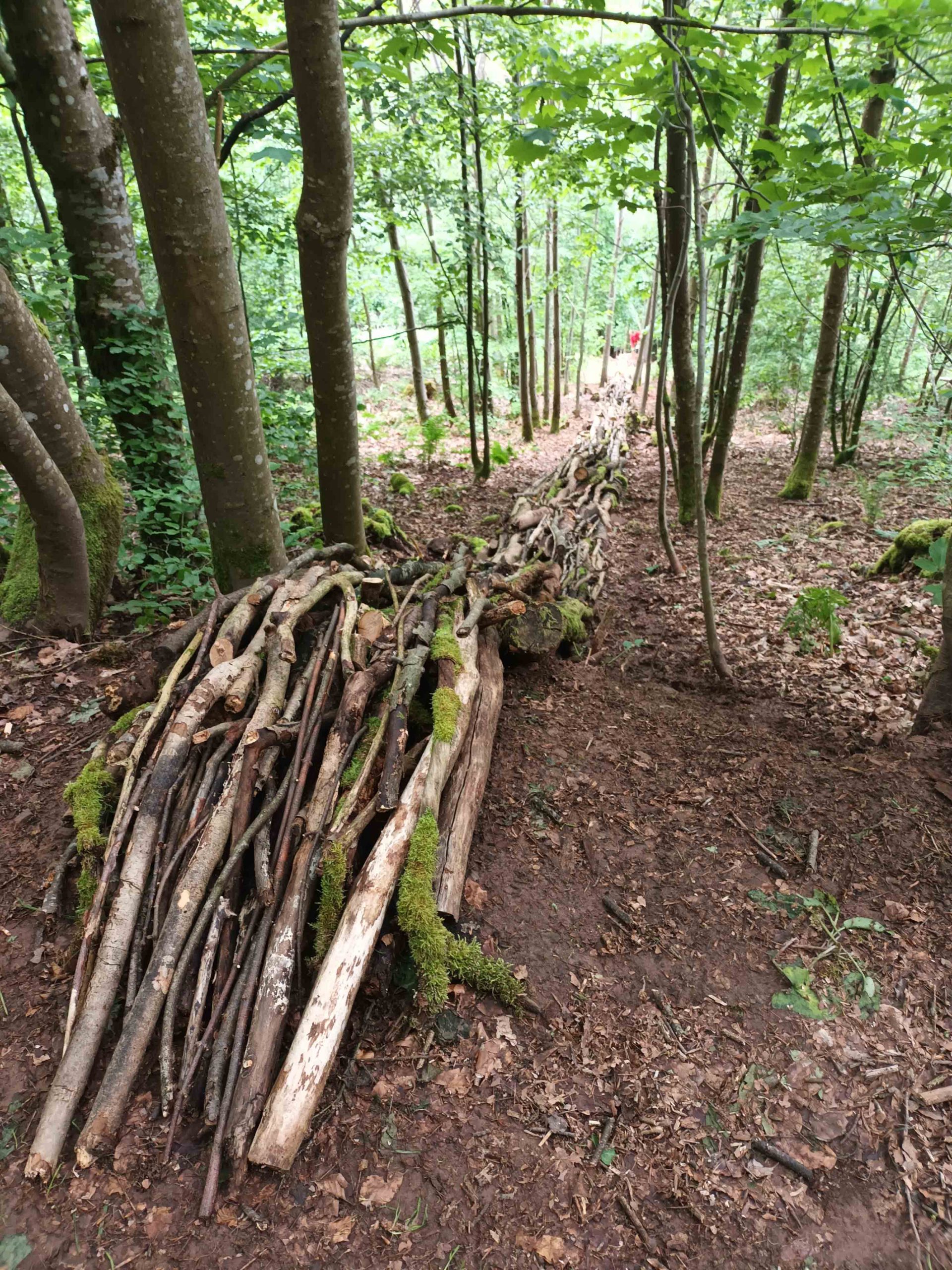Für mich ist Land Art eine Arbeit, die nur aus natürlichen, vor Ort vorhandenen Materialien besteht, ohne etwas hinzuzufügen – keine Seile, Schrauben oder ähnliches. Ich schaue mir an, was an einem Ort vorhanden ist, und versuche, es zu verbessern. Diese Spur aus Baumstämmen fließt, ja stürzt, mit Wucht den steilen Hang hinunter, mitten durch die Wanderwege, direkt zur Quelle.Danke an Olivier, Huub, Jan, Joop, Ron und Ton für ihre unverzichtbare Muskelkraft!